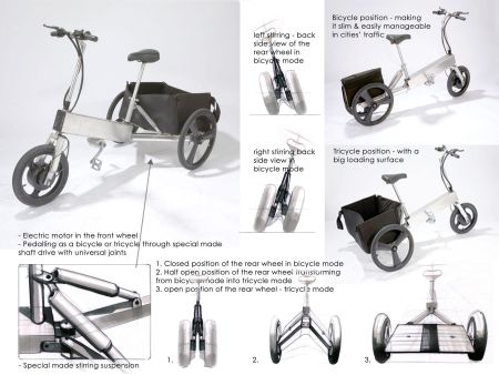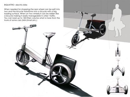 这辆折叠电动三轮车车身可以自由变换,非常适合购物时使用。通常情况下,它的两个后轮合并在一起,看上去与两轮自行车一样。此时可以节省空间,方便快速行驶于拥挤的街道。当您携带的物品较多时,就可以将两个后轮分开,软质后备箱随即展开。此外,这款车带有特殊的后轮悬挂系统,可以保证它在转弯时后备箱保持水平,防止里面...