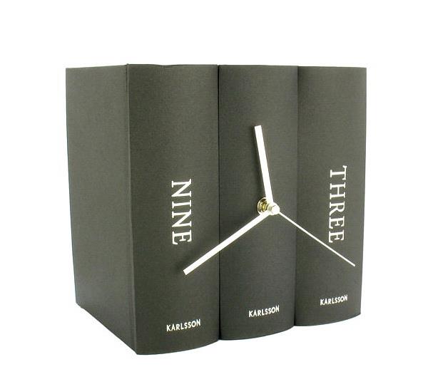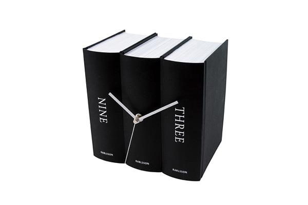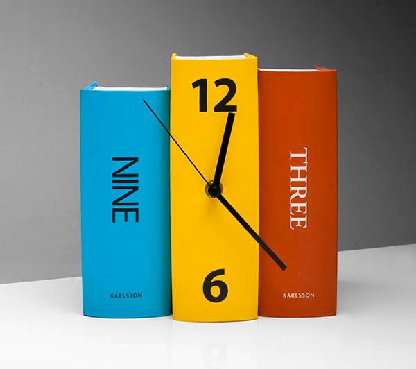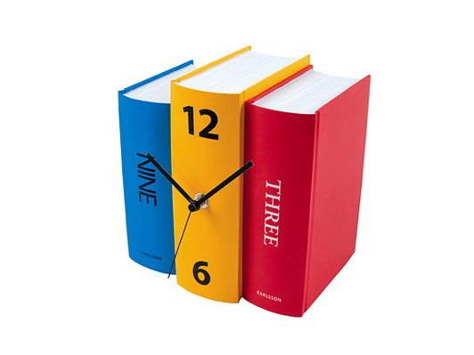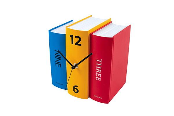 这组钟表创意十足,颜色亮丽,是一件不错的书架伴侣,书本被巧妙地用作钟表表面,使人们难辨真假,这款钟表包括两个版本,一种黑白的,一种彩色的。