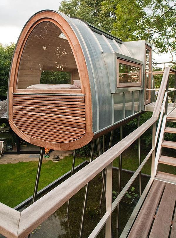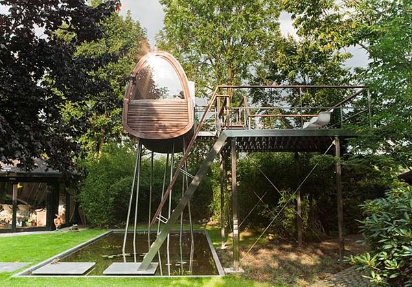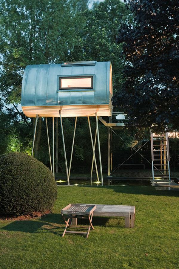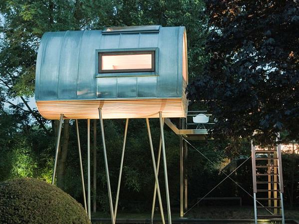 Tree House “King of Frogs”设计方:Baumraum位置:德国 明斯特面积:8.5平米这个装置富有创意,其实并不算传统意义的树屋,没有以活体树木做支撑,而是建在长长的杆上,在屋里能远眺倒影池。树屋面积虽然不大,还带有9平米的露台。这个装置位于当地一户私人住宅的后院里。